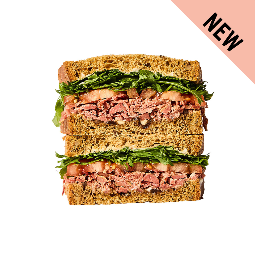 Multigrain Sliced Bread (Multiseed Bread Concentrate (Wildfarmed Wheat Flour (Calcium Carbonate, Iron, Niacin, Thiamin), Sunflower Seeds, Brown Linseed, Wheat Gluten, Pumpkin Seeds, Wholemeal Rye Flour, Oats, Wheat Bran, Dried Wheat Sourdough, Sugar, Salt, Caramelised Sugar, Emulsifier: Mono- and diacetyl tartaric acid esters of mono- and diglycerides of fatty acids, Flour Treatment Agent: Ascorbic Acid), Bread Flour (Wheat Gluten), Yeast (Saccharomyces Cerevisiae), Water), Salted Beef (Beef Brisket (75%), Water, Salt, Cure (Salt, Dextrose, Stabilisers: Diphosphates, Acidity Regulators: Sodium carbonate, Sodium citrates, Antioxidant: Sodium ascorbate, Preservative: Sodium nitrite)), Tomato, Horseradish Mayo (Horseradish Sauce (Water, Rapeseed Oil, Dried Horseradish (9%), Sugar, Salt, Acidity Regulator (Acetic Acid), Skimmed Milk Powder, Stabiliser (Xanthan Gum), Dried Egg Yolk, Mustard Flour, Preservative (Sodium Metabisulphite), Mayonnaise (Water, Rapeseed Oil, Cornflour, Sugar, Salt, Free Range Pasteurised Egg Yolk, Acidity Regulator: Acetic Acid, Flavouring)), Onion Chutney (Onion (44%), Sugar, Balsamic Vinegar (Wine Vinegar, Grape Must), Brown Sugar, Dried Onion (5%), Olive Oil, Gelling Agent: Pectin, Acidity Regulator: Citric Acid, Lemon Comminute), Black Pepper Mayo (Mayonnaise (Water, Rapeseed Oil, Cornflour, Sugar, Salt, Free Range Pasteurised Egg Yolk, Acidity Regulator: Acetic Acid, Flavouring), Black Pepper), Rocket.