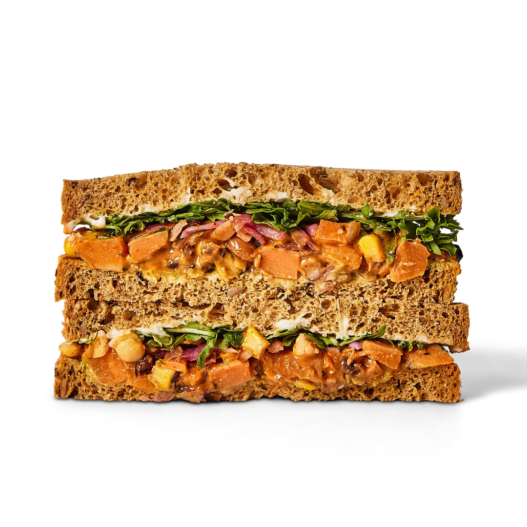 Multigrain Sliced Bread (Multiseed Bread Concentrate (Wildfarmed Wheat Flour (Calcium Carbonate, Iron, Niacin, Thiamin), Sunflower Seeds, Brown Linseed, Wheat Gluten, Pumpkin Seeds, Wholemeal Rye Flour, Oats, Wheat Bran, Dried Wheat Sourdough, Sugar, Salt, Caramelised Sugar, Emulsifier: Mono- and diacetyl tartaric acid esters of mono- and diglycerides of fatty acids, Flour Treatment Agent: Ascorbic Acid), Bread Flour (Wheat Gluten), Yeast (Saccharomyces Cerevisiae), Water), Bean Vegan Mix (Roasted Sweet Potato (Sweet Potato, Rapeseed Oil, Salt, Black Pepper), Corn Salsa (Sweetcorn, Red Onion, Red Chilli, Coriander, Salt, Lemon Concentrate (Lemon Juice Concentrate, Sodium Metabisulphite), Black Pepper), Mexican Bean Mix (Chickpeas, Black Turtle Beans, Red Kidney Beans, Borlotti Beans, Sweetcorn, Red Pepper, Yellow Pepper, Coriander, Chives, Salt, Black Pepper), Sriracha Hot Chilli Sauce (Chilli, Sugar, Water, Salt, Garlic, Flavour Enhancer: Monosodium Glutamate, Stabiliser: Xanthan Gum, Acidity Regulators: Acetic Acid, Citric Acid, Preservative: Potassium Sorbate), Vegan Mayonnaise (Rapeseed Oil, Water, Spirit Vinegar, Sugar, Salt, Modified Starch, Stabiliser: Xanthan Gum, Preservative: Potassium Sorbate, Lemon Juice Concentrate, Natural Flavouring, Turmeric, Colour: Paprika Extract), Chipotle Seasoning (Cumin, Paprika, Black Pepper, Chipotle Chili, Maize Flour, Salt, Sugar, Onion, Garlic, Acidity Regulator: Citric Acid, Lemon Juice, Basil, Oregano, Parsley, Tomato, Yeast Extract)), Hass Avocado, Pickled Red Onions (Red Onion (50%), Spirit Vinegar, Sugar, Water, Sea Salt, Black Peppercorns, Fennel Seeds, Coriander Seeds), Rocket.
